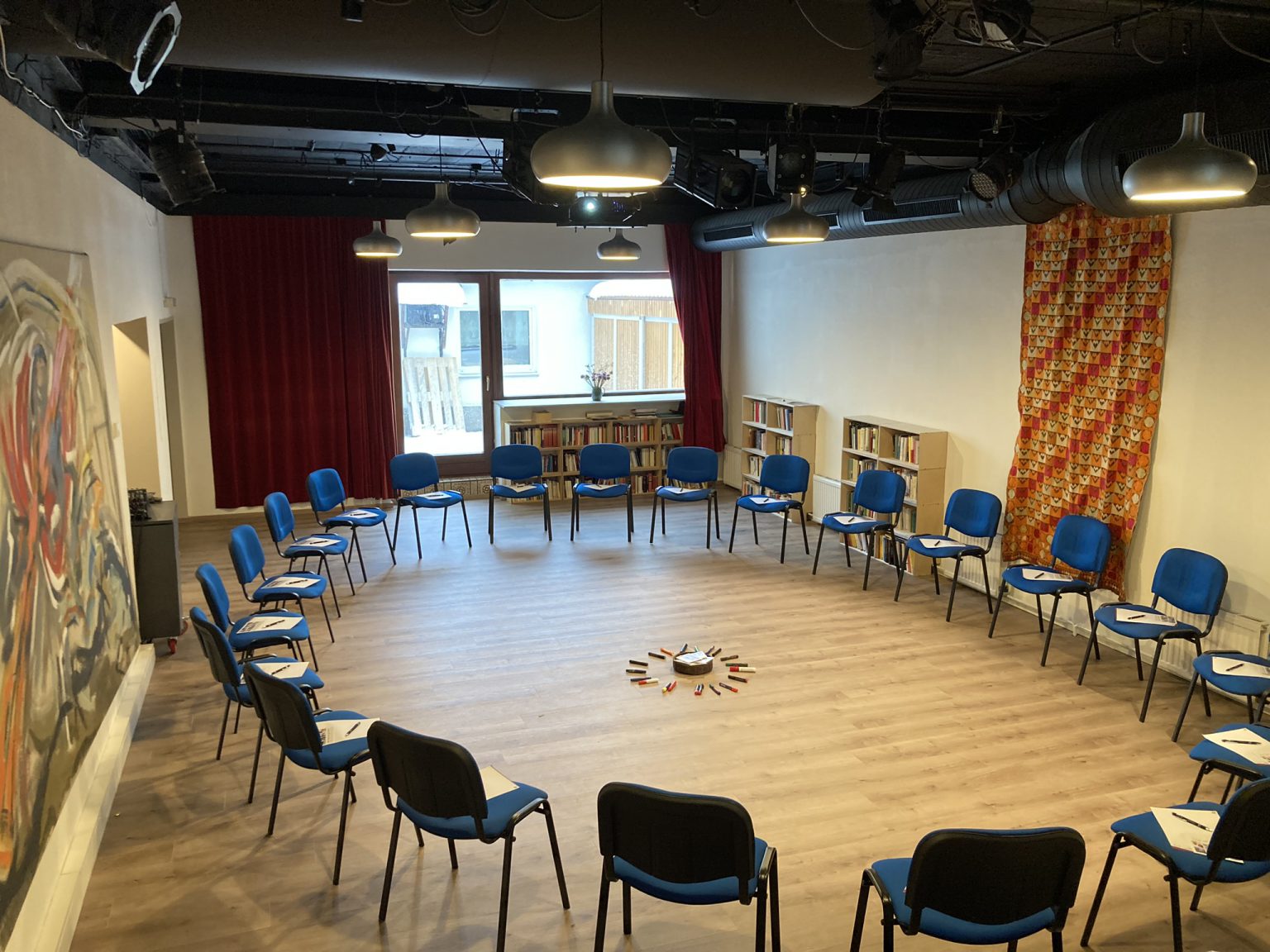 Ein freundlicher Seminarraum erwartet uns in einem Haus, das eine warme und persönliche Atmosphäre ausstrahlt.